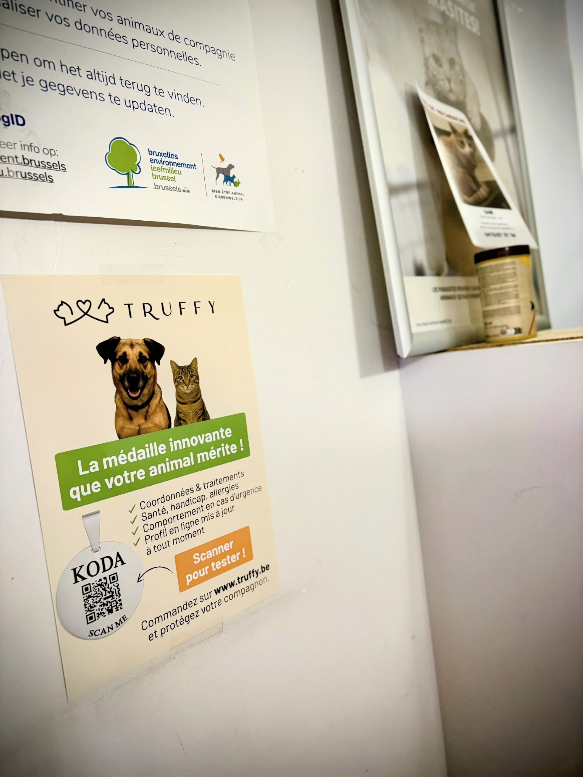 Les vétérinaires qui découvrent Truffy choisissent d'informer leurs clients grâce à nos affiches, car la médaille peut réellement aider en cas d'urgence.